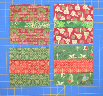 Step 1: To start Ornament A, sew 2-1/2" x 5-1/2" red pieces to opposite long sides of one 1-1/2" x 5-1/2" green piece. To start Ornament B, sew 2" x 5-1/2" green pieces to opposite long sides of one 2-1/2" x 5-1/2" red piece.
